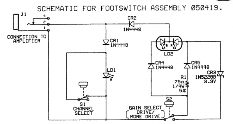 L'intérieur du footswitch est constitué d'un circuit électronique complexe, à savoir une diode Zener de 3,9 v (CR3), et de 4 diodes 1N4448 .