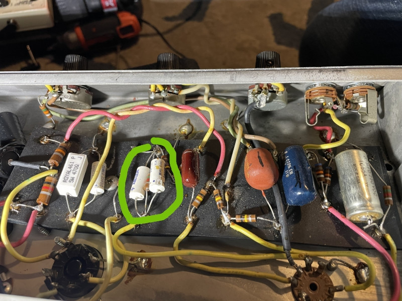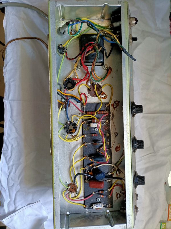 Bref pour nos amis techniciens je vous partage quelques photos de l’ampli. Je l’ai acheté chez un tech dont le boulot est de réparer et concevoir des amplis, le hp a été remplacé (hp un peu sombre à mon goût je regarde un peu les Weber mais pas évident d’en trouver), les condos remplacés (je n’y connaît absolument rien).