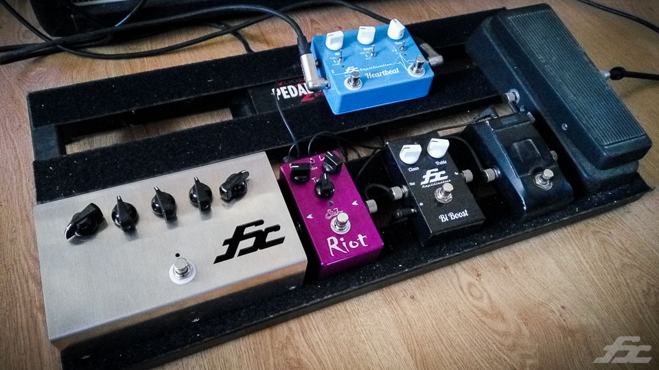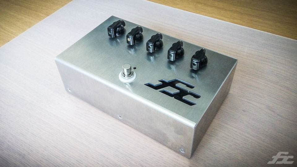 En dessous du logo decoupé brilleront les 2 loupiottes (c'est du 100% lampe), et ce sera du vrai gros composant dedans (les meme que dans un Fxamps normal). Pas de petits WIMA ou de metal film 1w comme dans la plupart des pedales !