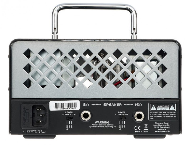 5 watts tube amplifier head for electric guitar, class A circuit with power attenuator, 1 channel, pre-amp tube 12AX7, power-amp thomann tube EL84, controls for bass, treble, volume, power attenuator 0.1W, 1W, speaker outputs 8 & 16 Ohms, jack input (6,3 mm), sturdy metal chassis, dimensions whd: 205 x 127 x 140 mm, weight 3,2 kg