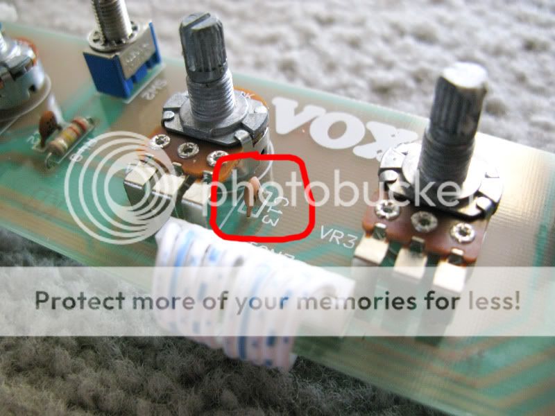 3/ Pour la dessouder, pas la peine de s'embêter à démonter les PCB et à les enlever du chassis, c'est assez galère (même si c'est comme ça qu'a fait le gars de Harmony Central). Une fois la Capa localisée, Basculer l'ampli face contre terre, cela permettra à la capa de tomber sur la partie métallique accessible, une fois dessoudée. Un coup de fer à souder avec de la tresse à dessouder ou une Pompe à dessouder et elle doit tomber (sinon passer un bout de fil de fer dans les trous pour la faire sortir). Pencher l'ampli pour faire sortir la Capa par la Gauche et ainsi ne pas la laisser se balader (ca pourrait faire un cour-jus !). Et voilà, c'est fini ! Plus qu'a remonter le panneau arrière et zou ! Si par la suite, ça ne vous plait pas, vous pouvez remonter la Capa par en dessous, et essayer une valeur différente, pas besoin non plus de démonter le PCB !