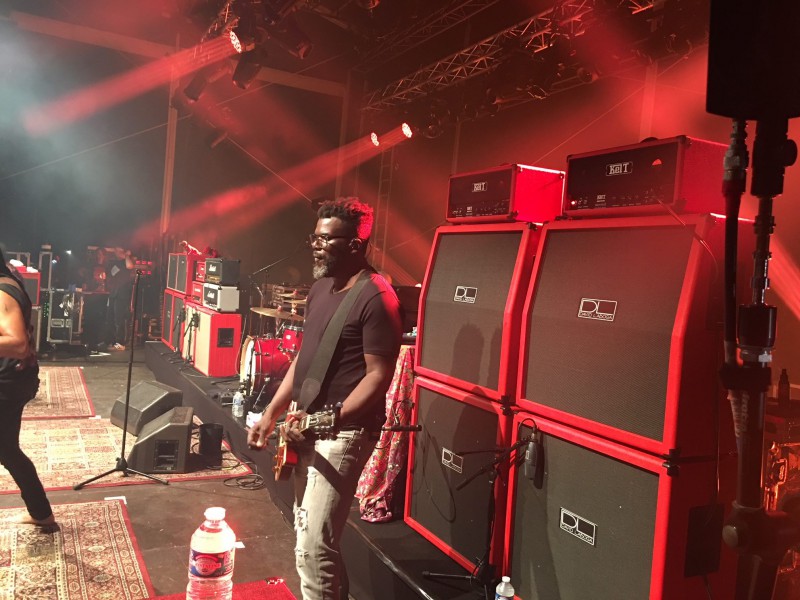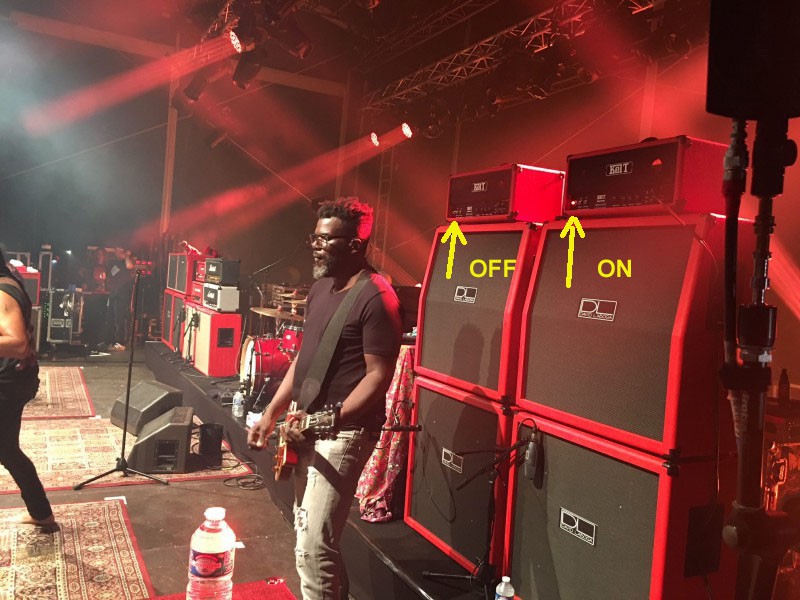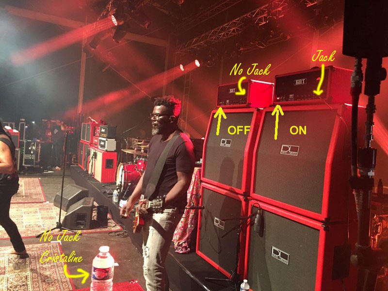 Effectivement, il n'y a qu'un stack en service, l'autre est en spare, in case !!! Par ailleurs, la bouteille de Cristalline est posée sur un JCM 800 & son 412 qui sert de retour au chanteur...