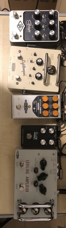 J’irai écouter. Après c’est pas vraiment une quête... ou disons que j’en vois la fin... plus que les sons Dumble à la Robben Ford c’est surtout les sons à la Mayer, Éric Gales, qui me font triper. Mais là mon son a pas mal changé depuis l’arrivée de la Cali76. Le son a gagné du sustain sans gonfler les basses anormalement et les aigus y ont gagné du « sparkle », je crois qu’on dit ça comme ça. Et mes overdrives sonnent tout à fait différemment... la Jan Ray et l’Oxytone font merveille et en poussant le gain du MostrO et en jouant sur la dynamique, j’arrive à un résultat très proche de Slow Dancing in a burning room comme base clean que je pousse avec les deux autres. Je me rends compte que je suis loin d’avoir fait le tour du matos que j’ai déjà, alors remettre encore des trucs en plus m’ennuie un peu. C’est même pas un problème de sous ; plutôt le besoin de maîtriser ce que j’ai déjà.