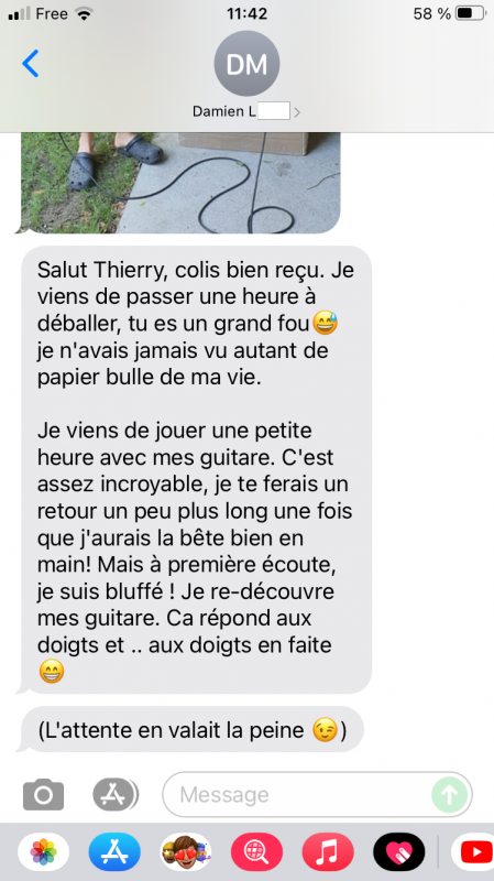 Bon bref, pour moi le débat est clos. Le but n'est pas de pourrir l'image de KelT qui ne le mérite pas, même si rendre ces défaillances publiques était plutôt nécessaire selon moi. Je pense que ça nous a fait du bien à tous de se rendre compte qu'on était loin d'être les seuls à attendre depuis des mois après la date de livraison prévue, tout en voyant des nouveaux amplis et prototypes défiler sur les réseaux et chez les pros. D'un autre côté, Thierry nous a à nouveau assuré qu'il faisait le max et ses amplis sont toujours aussi classes donc le mieux est de continuer à prendre son mal en patience sans trop y penser.