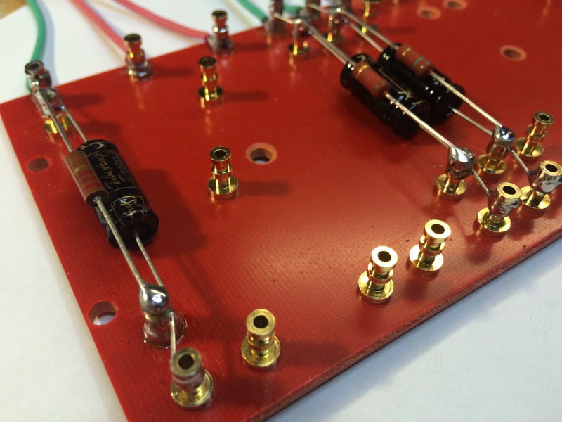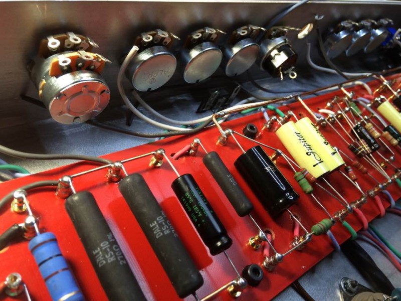 Habitué à son Deluxe Reverb (entièrement recâblé en point à point soit dit en passant et du coup sagement resté à la maison), il place sur scène le cab incliné et la tête sur un fly.