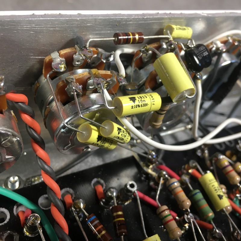 Le signal attaque les deux canaux V1 et V2 simultanément, et donc un étage de gain V1 et une étage de V2 en parallèle. V1 est suivi du tone stack original SilverTone et V2 est suivi d'un tone stack spécifique à DrZ. Les deux Tones Stack sont commandés par les mêmes "boutons" Treble et Bass, grâce à deux potentiomètres stéréo. Donc...