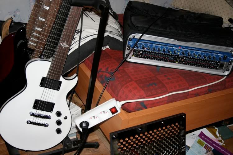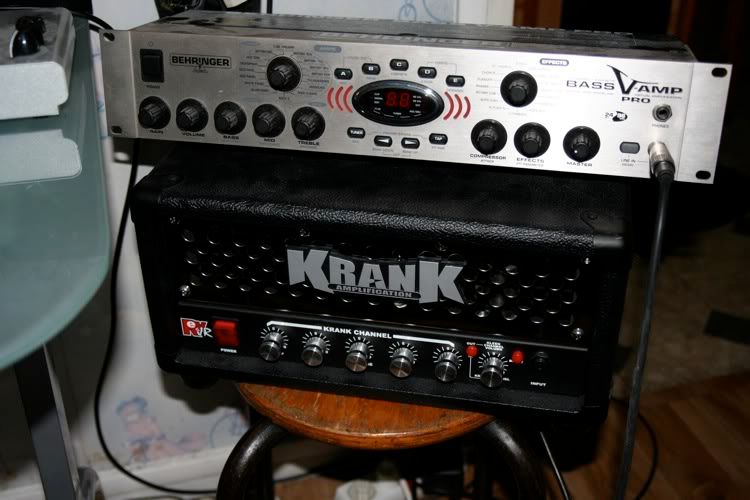 Krank Rev JR -> Repiqué par un micro Shure PG57 (le micro du pauvre lol) -> préampli micro Berhinger Mic200 -> Compresseur/Enhancer Samson S-Com+ -> Equaliseur Berhinger FBQ 1502 -> M-Audio Audiophile USB -> Imac Leopard: Reason/Garage Band/Audacity.