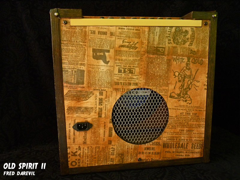 Dans un esprit récup' entre Robinson Crusoë répare son ampli et Butch Cassidy s'en fabrique un j'ai donc réalisé un caisson en vrai bois d'arbre pour accueillir un HP de 12" à haut rendement, l'excellent GB128 de chez Eminence récupéré sur un autre ampli qui ne le méritait pas. Cuir cousu au fil de cuir, bois flotté récupéré sur une plage en Bretagne, anciens clous de maréchal ferrant et reproduction de journaux US de 1888 voilà ma version du Marshall Code 25. Et ça sonne du tonnerre de Dieu ! Il y en a qui ne vont pas aimer et c'est tant mieux...