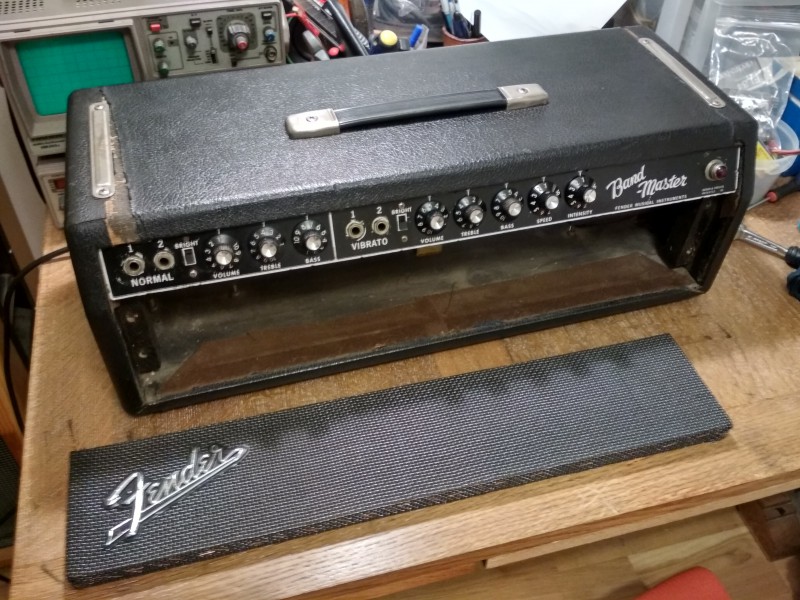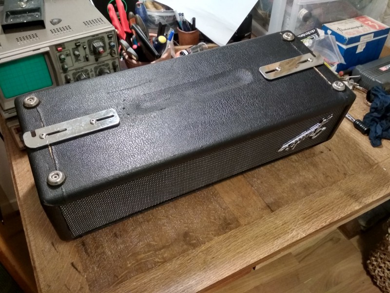 8O il est bien revenu. Franchement le tolex est plutôt en état correct tu devrais le laisser ainsi. Il faut juste refaire le grillcloth devant et mettre 4 coins aux angles et il sera parfait.