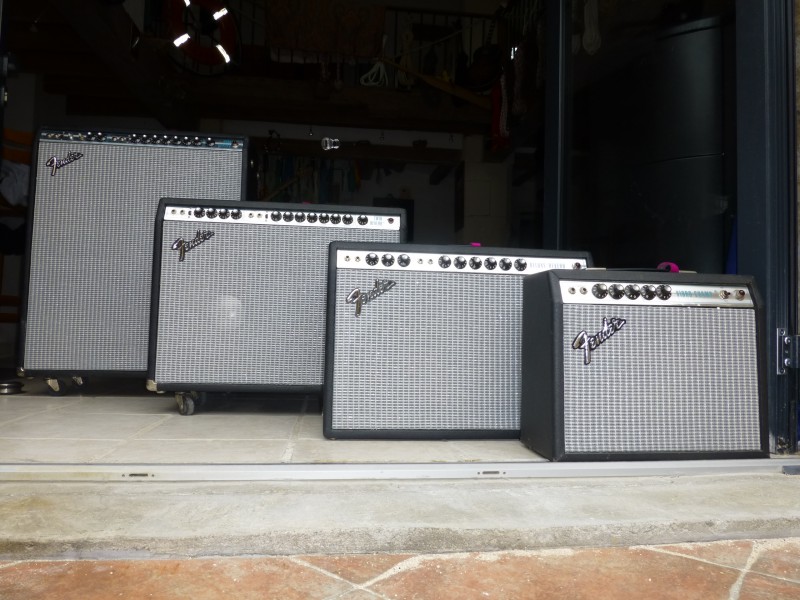 Quad Reverb '74, Twin Reverb JBL '77, Deluxe Reverb '77 & Vibro Champ 76 (cadre juste en appui)