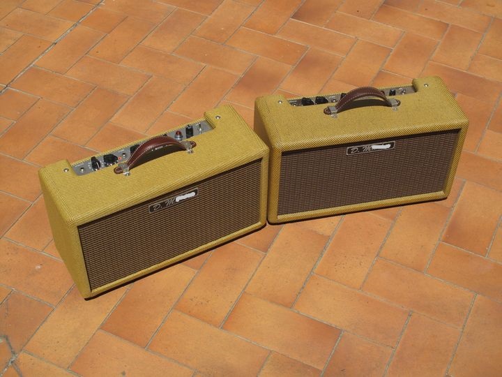 Celle de droit est une "simple" reverb à lampes, transfos Mercury, condos Orange Drop, switches Carling, jacks Switchcraft, boitiers de ressorts Acutronic (ca commence à être chaud à trouver...), tweed lacqué, tissus oxblood....