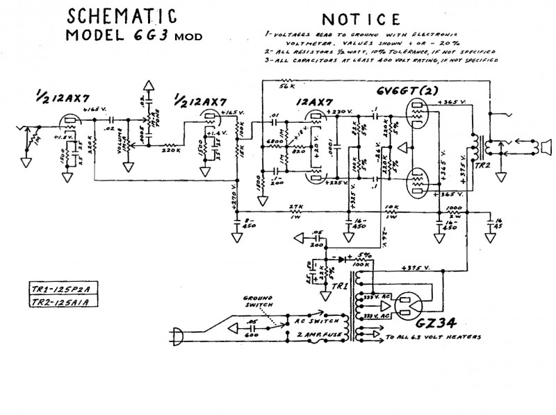 J'ai aussi regardé certains schémas d'amplis Fender à 2 entrées mais un seul canal (Princeton 6G2 ou Princeton 5F2), en sortie de tonestack, la liaison est directe avec la grille de la triode qui suit... or moi, j'ai gardé la résistance de 220K qui servait initialement à mixer les canaux bright et normal du 6G3. A priori il me semblait que ça ne pouvait pas faire de mal mais... je me demande du coup !