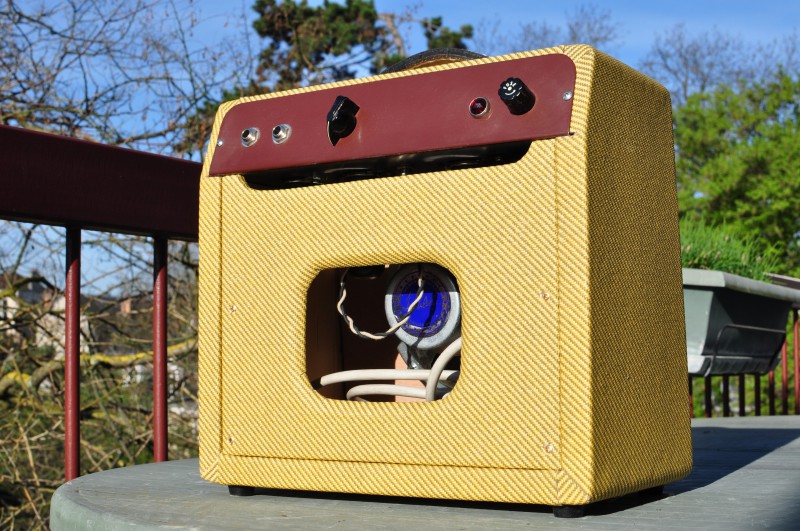Le cab' tweed en pin et le chassis proviennent de chez Farfield Amplification (Belgique. Anton est un mec super sympa et son travail est très propre).