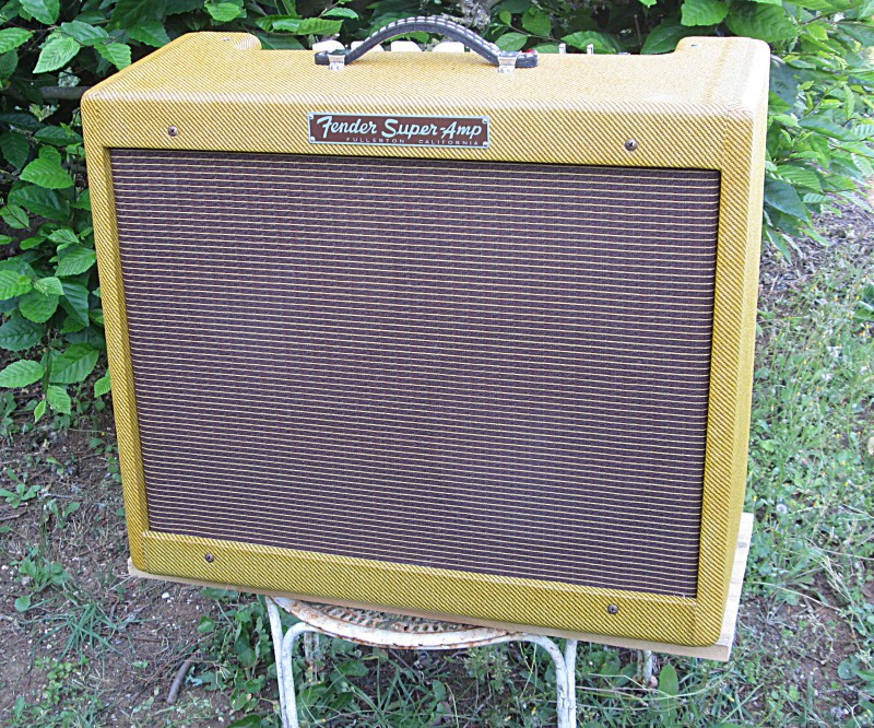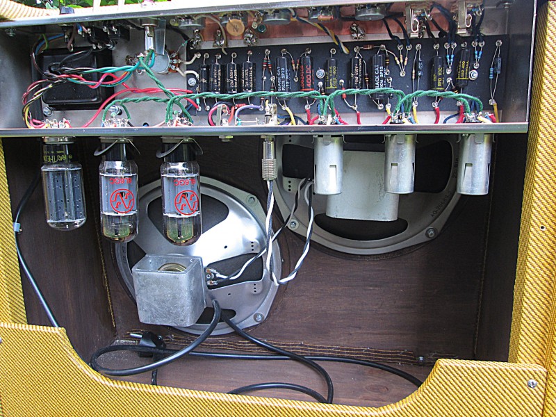 Voici ma version toute fraîche vernie à la gomme laque du Super-Amp, 2 x 6L6 chantant dans deux 10" Rola d'époque ! Transfo alim Hammond, de sortie Classictone, condos vintages US, lampes de préamp NOS (blindages et sockets d'époque). Bus de masse en feuillard de cuivre.