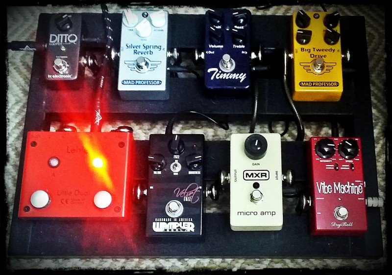 Côté pédales c'est ça (la vibe a giclé et à la place Box of Rock que j'utilise pour toutes les parties rythmiques AC/DC). Ma pédale principale de lead c'est la Mad Professor BTD. Avec Timmy souvent après. Ou le boost de la BOR avant. En concert le Ditto cède sa place à un accordeur.