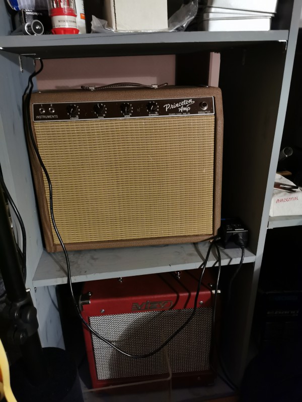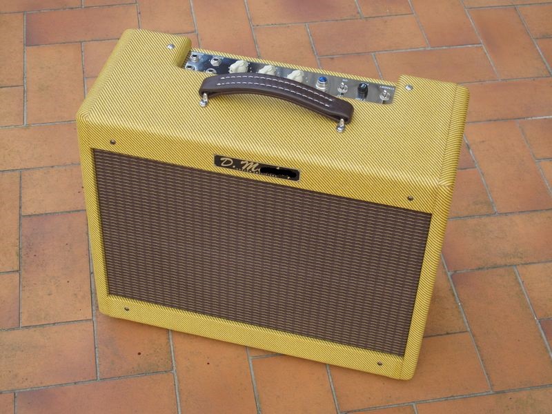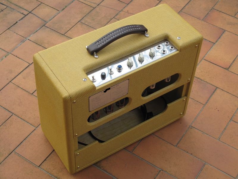 Un petit Deluxe 5E3, avec le look d'origine (tweed laqué à la gomme laque par moi-même et oxblood), avec des composants "qui vont bien" (transfos Mercury Magnetics, HP Weber 12A125 alnico, switches Carling, jacks Switchcraft, condos Orange Drop...etc)