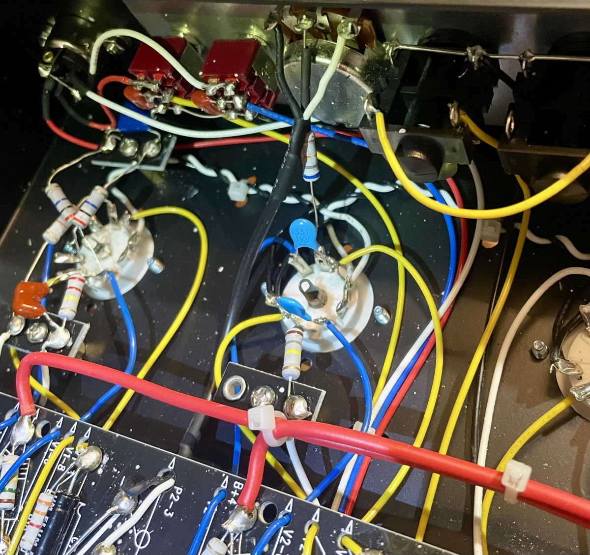 En attendant de recevoir mes Carbon comp en 1/2W, j’ai lu que remplacer les snubbers caps sur V2 (je ne sais comment traduire ça !) qui sont des céramiques de 330pf par des valeurs beaucoup plus basses, permettait d’avoir des basses plus tenues en od.