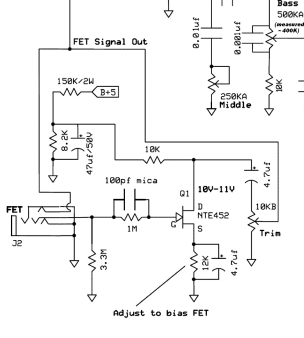 "When setting the bias on the FET, are you supposed to be adjusting the voltage that is dropped by the 10K resistor between the drain of the FET and 150K resistor tied to B+? So at the junction of the 10K and 150K, you should have about 20 volts, Then at the drain you should have 10 volts?