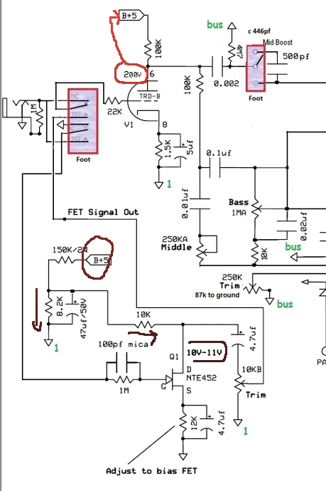 un exemple ici : la H.T. ( ici B+5) est d'environ 200V MAIS ils l'écroulent avant le FET par la résistance de 150K puis celle de 8.2K et enfin celle de 10K, tant et si bien que l'on se retrouve avec 10-11V sur le FET.
