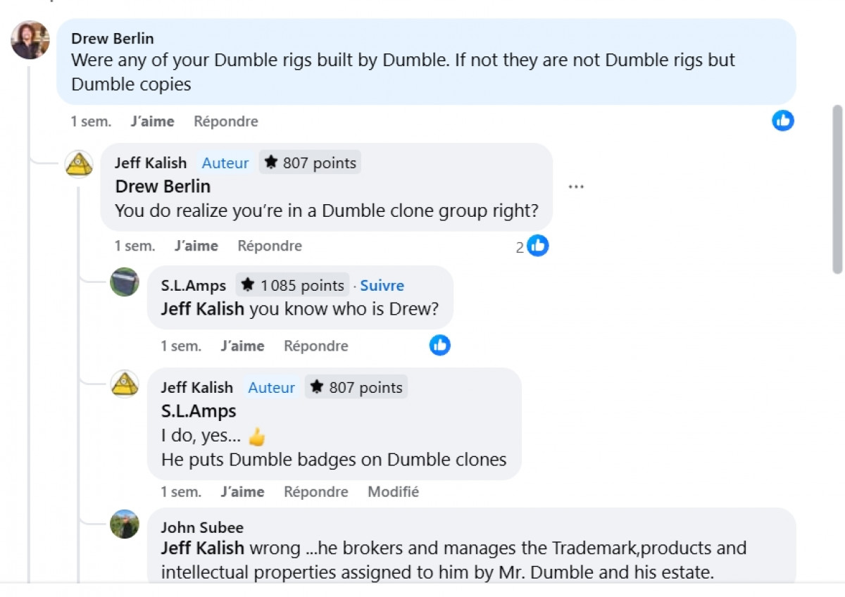 Et tout de suite le fameux Drew Berlin de le reprendre : "Were any of your Dumble rigs built by Dumble. If not they are not Dumble rigs but Dumble copies" !!!