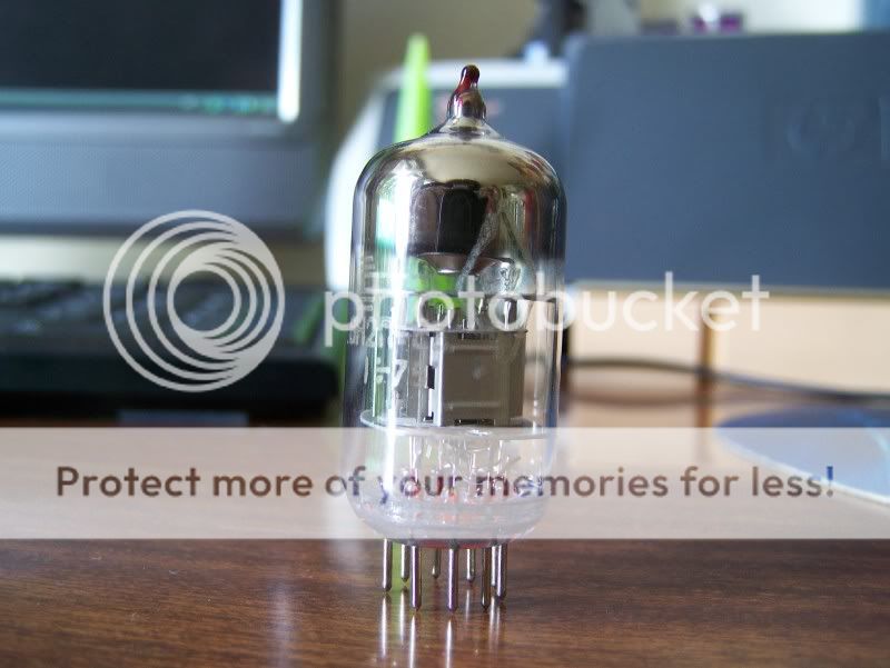 Mazda 12ax7A "shiny plate" : C'est une mazda plaque argentée, c'est beau en plus de sonner, alors que demander! C'est TRES chargé en basse, et c'est justement paradoxal, car ce n'est pas sombre! C'est juste qu'elle possede de belles grosses basses bien envahissantes, mais garde ce coté péchus médiums-aigus. Ca distord pas mal, mais pour moi ce n'est pas son domaine. Par contre en clean/crunch, c'est terrible, c'est vraiment un tube de clean pour moi, couplé a une 12ax7S Triple Mica Mazda, c'est le paradis! En crunch on a l'impression que les basses distordent, c'est vraiment chouette!