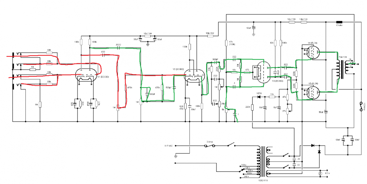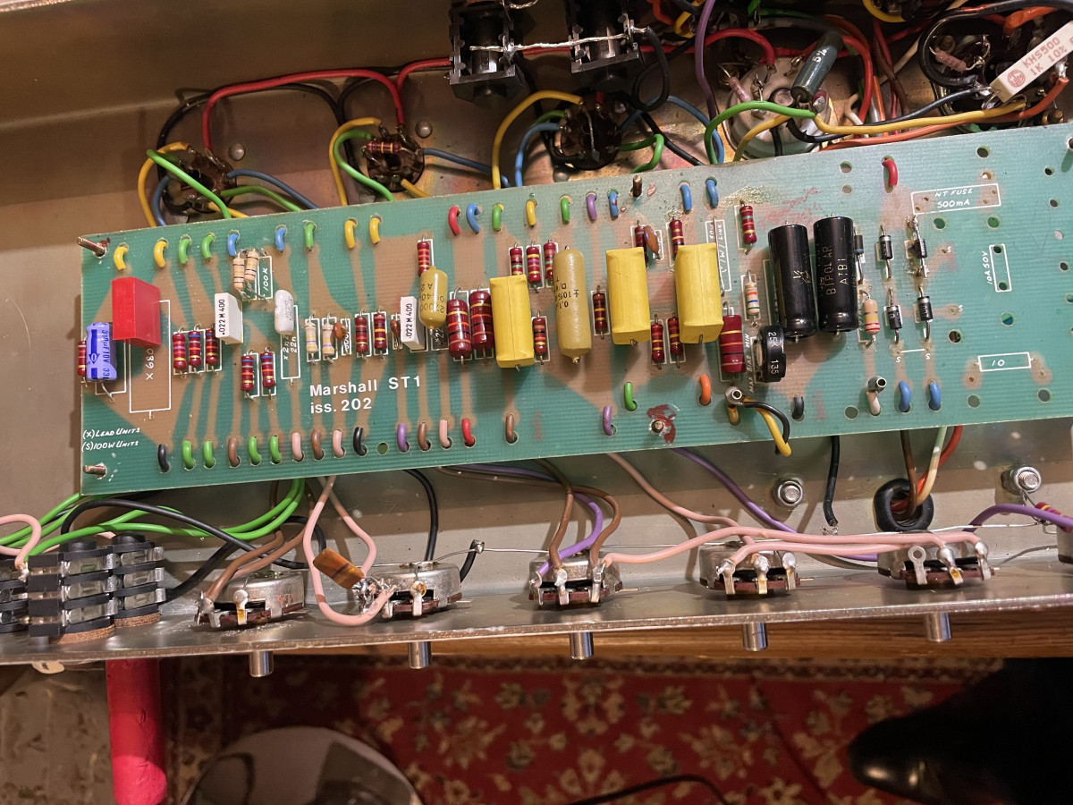 mon constat a l ouverture : une résistance de 1k verte sur le soket d un el34 complètement hs , j enleve les tubes jj neuf et la dessous sur le soket qui avait chauffer y avais plus le détrompeur dessous le tube incroyable , le joli condensateur de présence de 100nf a été remplacé par deux condo de 0,47uf en série , dans l ensemble pas très pro comme révision pour un gros magasin