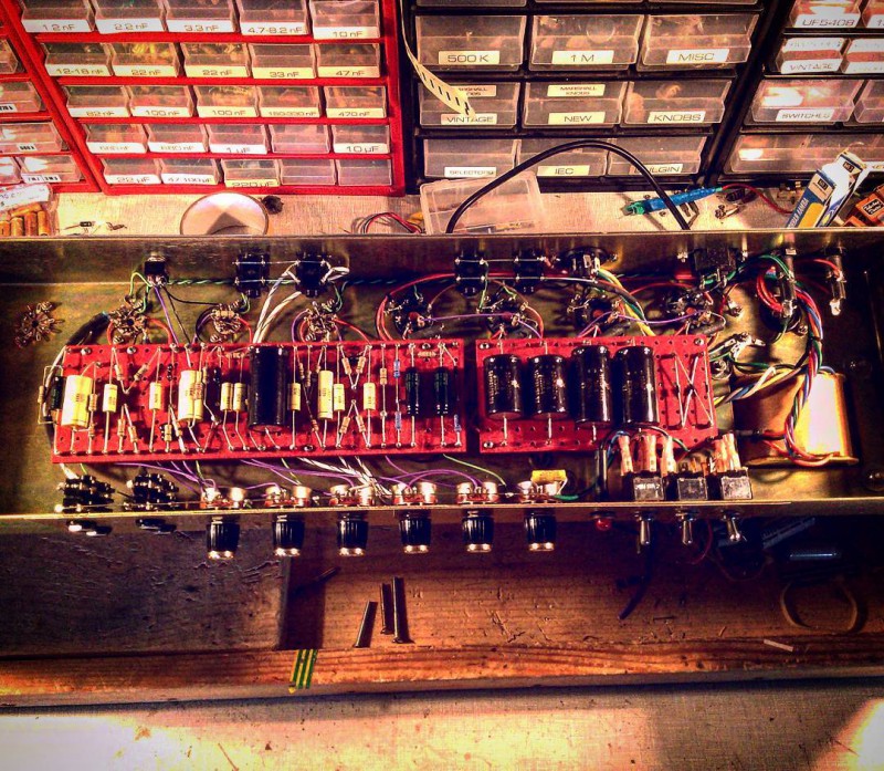 Les petits + qu'ils ont installés : mid boost à trois positions. En fait c'est avec ou sans le 680nF de V2 et la troisième position c'est avec le 680nF et un low pass entre les mixers et l'entrée de V2.