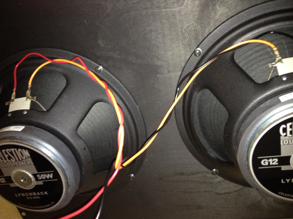 tu as deux jacks actuellement câblés en parallèle et tes HP câblés en série. Donc à priori tu as le - du HP gauche relié au + du HP droit (ou l'inverse, mais on part sur ce principe), et le + du HP gauche et le - du HP droit reliés au + et - du jack 'IN', et de là partent deux fils en parallèle vers le jack 'LINK' (pour brancher un deuxième cab en parallèle et non pas en série).