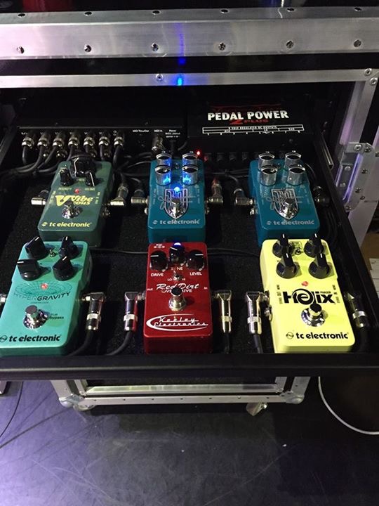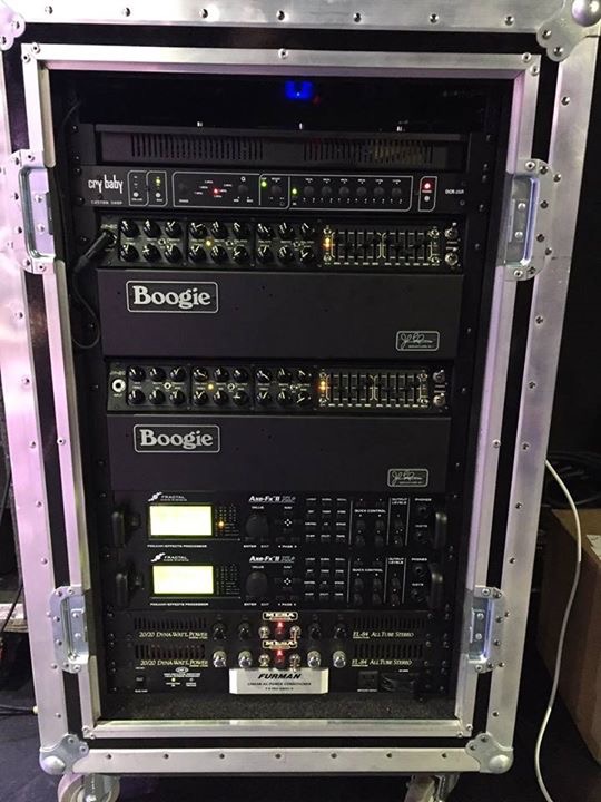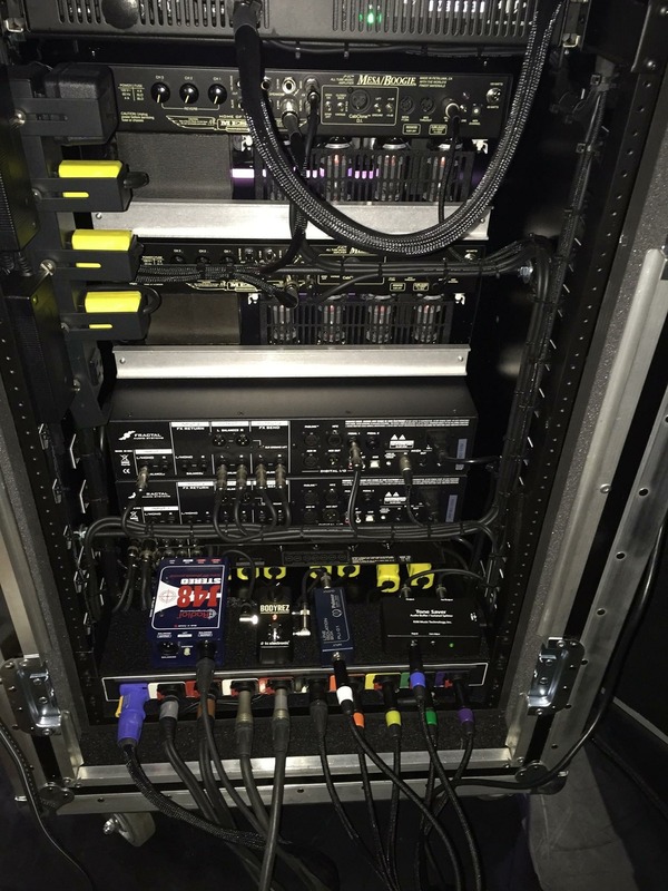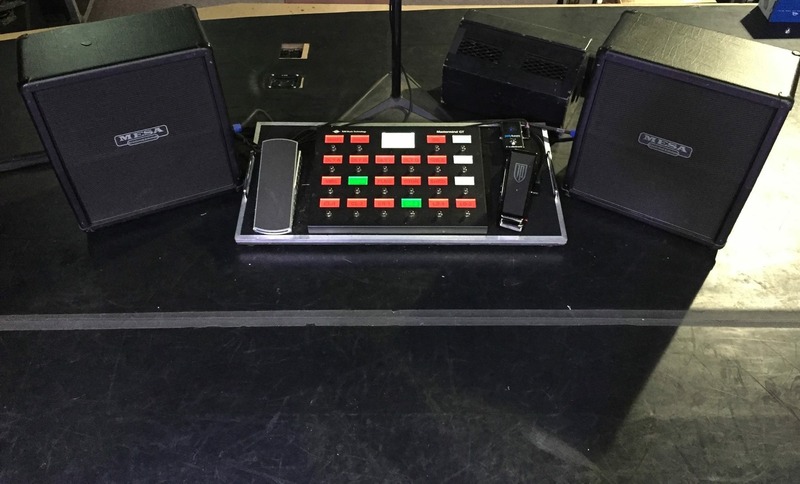 De l'autre les 2 baffles à son pedalboard qu'il utilise en retour pour avoir les sensations de jeu devant un baffle. Le son dans les ear monitor c'est un mix instru avec comp, eq, etc donc t'as pas les sensations que t'as devant un ampli et donc il veut les retrouver avec les baffle guitare en façade, d'ailleurs c'est pas une mauvaise idée je trouve.