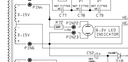 Mal dimensionné je ne le pense pas. Le transfo délivre 6.35volt efficace soit + en valeur maximale et la résistance qui existe déjà est bien là pour faire redescendre la tension à la valeur nécessaire pour la diode.
