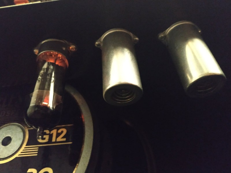 Parmi les lampes j'ai retiré le cache en métal de l'une d'elles (tout à droite dans la photo). La lampe s'allume ultra faiblement quand j'allume l'ampli (on perçoit deux toute petits points lumineux)