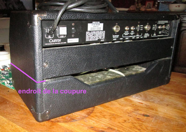 il y a peu, j'ai "coupé" un Carvin 100W en deux ! en fait, je me suis arrangé pour que le bas du cab, coupé à environ 10 cm, se raccorde avec le haut du cab (partie qui contient le chassis), coupé juste sous les tubes de puissance. ensuite, en perçant des trous bien en face dans la tranche on met des tourillons de 8 et on colle le tout. bien "effacer" le joint à la pate à bois. avant de couper le cab, il faut décoller le tolex sur les coté pour le recoller sur la partie inférieure qui, elle, sera entierement détolexée. on remet ensuite le morceux inférieur de tolex et hop ! on n'y voit que du feu !