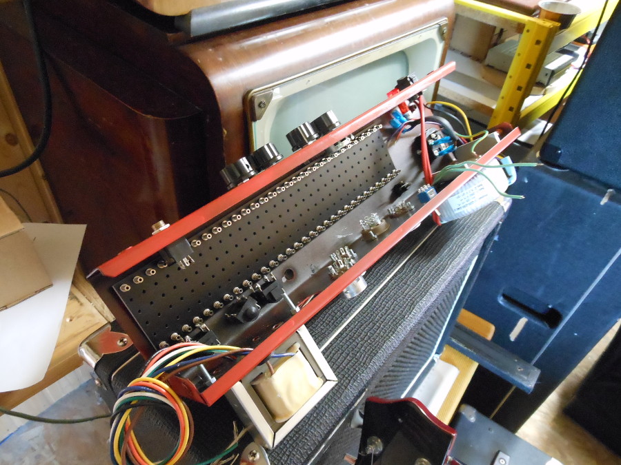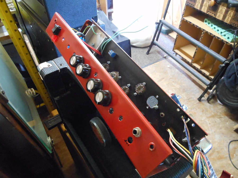 bref, 3 12ax7, un class A avec 1 6v6 ou 1 6l6 au choix ( un switch est prévu pour le changement) contre les 15w du princeton ( 2x 6v6), un volume et un tone, speed et intensity pour le tremolo, et une sortie HP 8ohms supplémentaire.