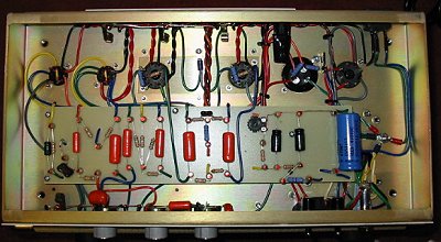 En fait rien de transcendant dans cet ampli ! Une EF86 avec des valeurs classiques suivie directement par la déphaseuse long tail, là aussi avec des valeurs très classiques. Résistances couche carbone et condo Orange Drop...