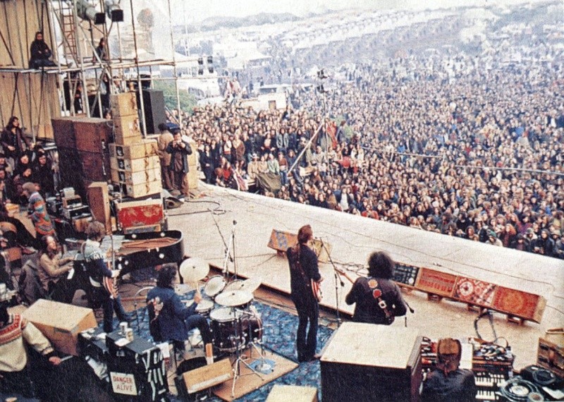 Ci dessous une vue de led zep en 72. comme on peut le voir, le system correspond simplement à un stacking des différents éléments du P.A de chaque coté de la scène + (innovation majeure) une encenite de midrange tourné en side fill de chaque coté de la scène faisant office de retour.