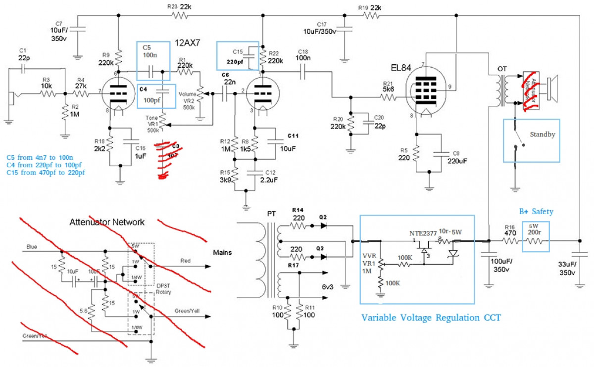 Si tu supprimes C3 sur le tone, ça le transforme en bright réglable... Si tu fais le VVR n'oublie pas de mettre le NTE2377 sur un radiateur en alu, isolé. Sinon il va cramer en utilisation basse tension !
