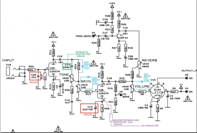 perso , je n'ai rajouté que les 3 capa de 220pF (en bleu ciel sur le schéma) et laissé les autres modifs de coté , ne voulant pas dénaturer le son de l'ampli.