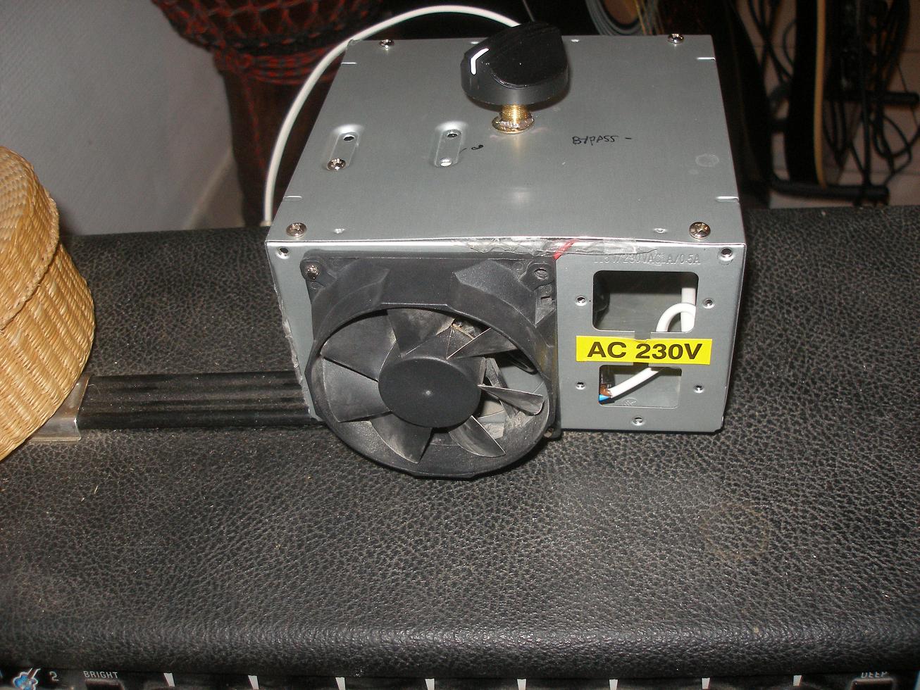 J'utilise un potar 2 x 100 watts de 8 ohms, à impédance fixe que je cable en // pour l'utiliser en 4 ohms ( du coup je profite d'une puissance théorique en crête de 200 watts ... ) et j'ai adapté un systéme de ventilation par FAN sans l'aide d'alim extérieure, j'utilise le joli signal BF de mon ampli ! Et je dois dire que c'est assez ludique de regarder le FAN s'activer au rythme du jeu ...