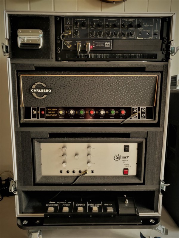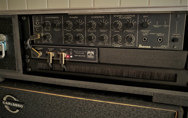 Mon setup en ce moment, 1 Carlsbro CS60 et un Selmer Treble & Bass 50, le tout dans un rack avec un boitier Palmer Tino pour pouvoir brancher deux têtes sur un seul baffle, et un multi-effet Ibanez UE-400 analogique format rack, qui contient entre autres une Tube Screamer début 80s.