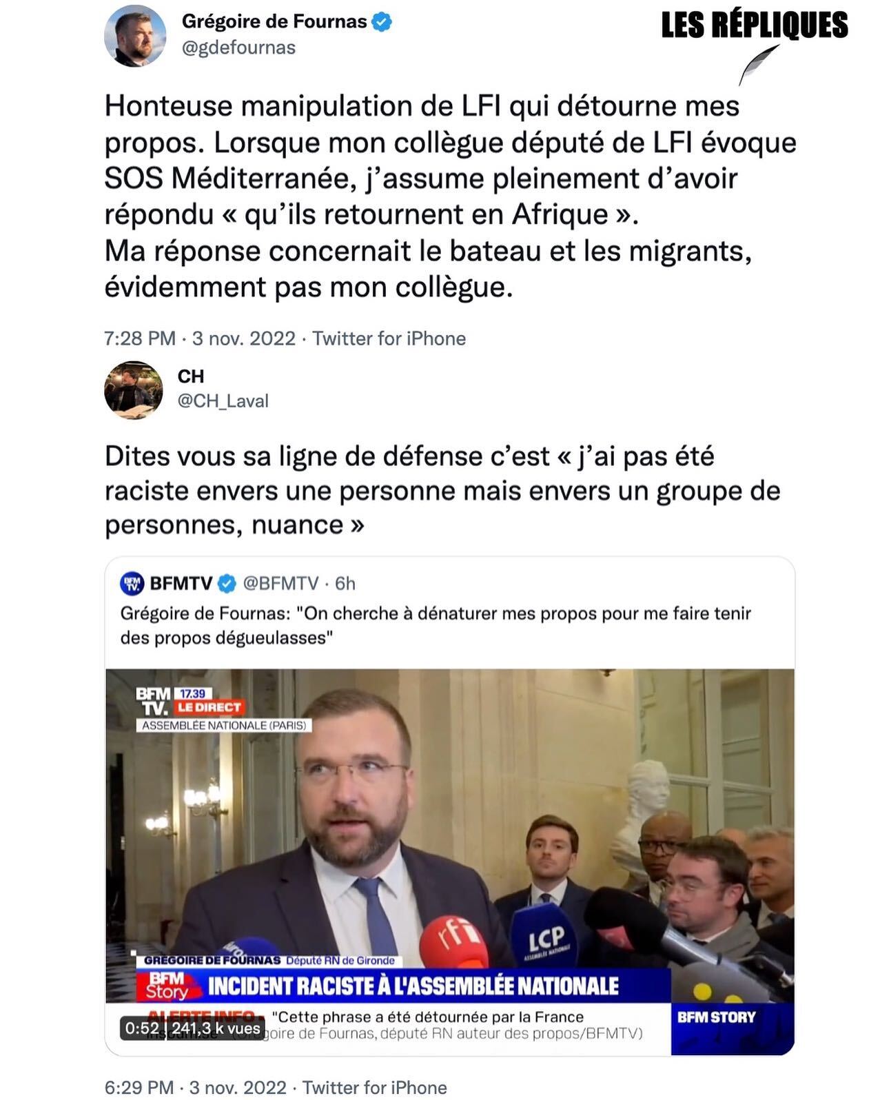 Le 3 novembre 2022, lors d'une séance de questions au gouvernement à l'Assemblée nationale, Grégoire de Fournas interrompt la prise de parole du député La France insoumise (LFI) Carlos Martens Bilongo au sujet de l'immigration clandestine en lançant : « qu'ils retournent en Afrique » ou « qu'il retourne en Afrique »