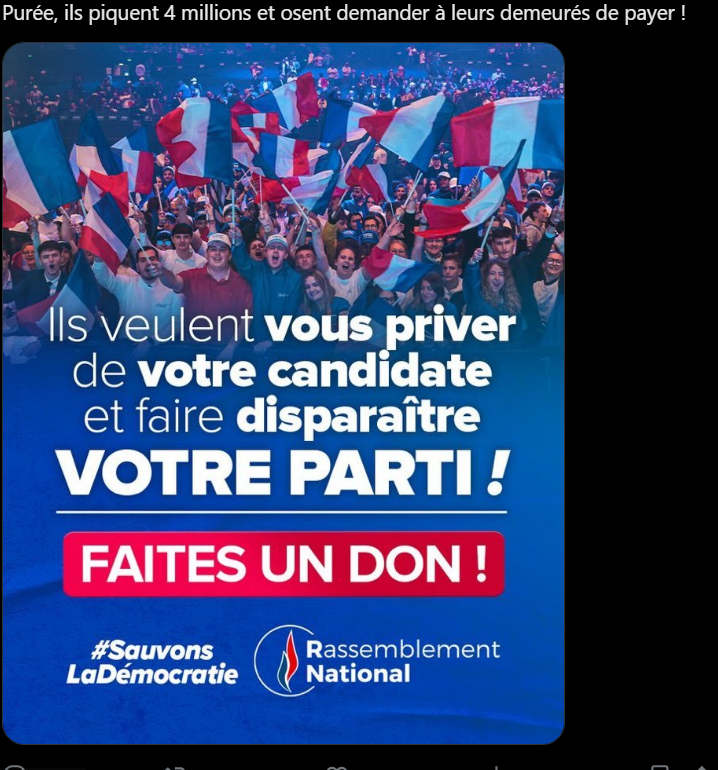 MLP est en mode "si vous me condamnez, vous condamnez la future présidente contre la volonté du peuple". Ca parle de juge rouge et hurle à la politisation des juges. Retailleau aussi, ça montre bien qu'il est d'extrême droite ( pourtant j'ai vérifié, les juges n'étaient pas algériens).