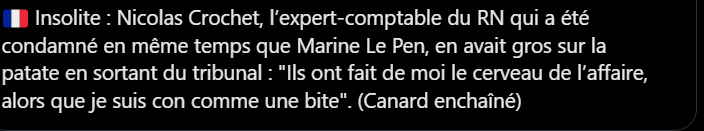 Le problème pour moi c'est que cette parole qui est normalement difficilement entendable (nier la justice, accuser de complot, d'une justice politisée etc...) est plus que mis en avant dans la presse, et le monde politique conteste trèèèès mollement ces allégations, quand ils ne lui donnent pas raison, car plus ou moins concernés...