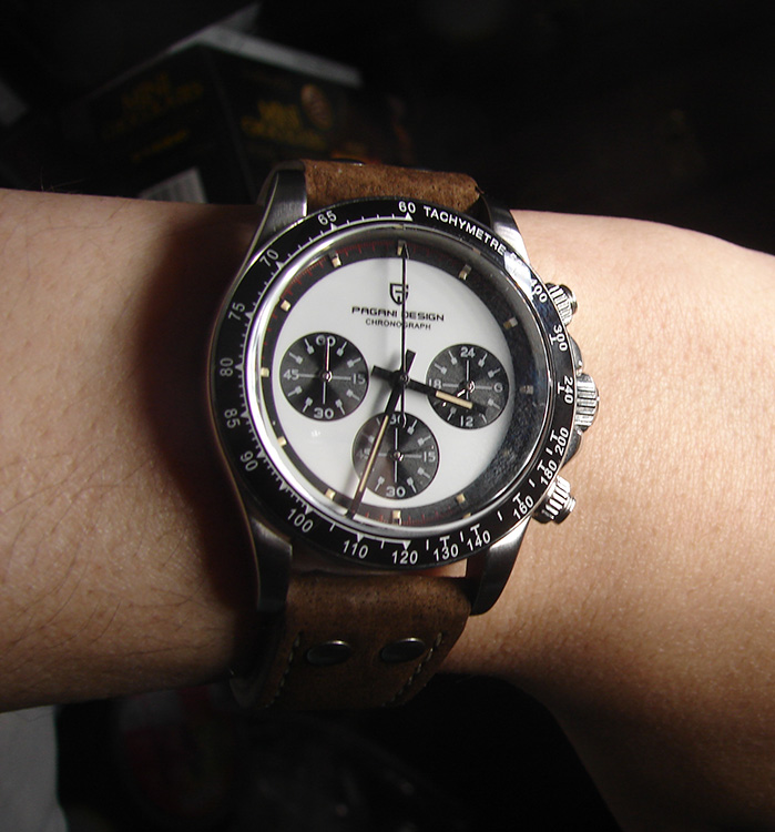 Les boutons et la couronne sont à viser (pour éviter de démarrer le chrono par accident, et pour rendre la montre + étanche, bien qu'à mon avis c'est pas vraiment une montre pour les sports aquatiques, surtout avec mon bracelet en cuir). Il faut pousser et ressentir un petit déclic pour démarrer le chrono, un peu à l'ancienne...voilà rien d’inattendu, c'est un peu la même que la plupart des autres montres chronos de la marque (en VK63) avec juste un look vintage qui change. Il y a de nombreux tests de cette montre sur le net (les vendeurs/testeurs Aliexpress sont légions).