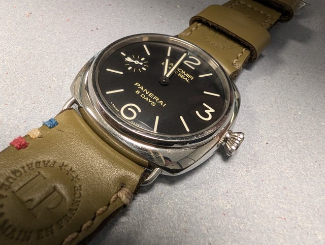 ), ma première d'ailleurs, d'une luminor marina 312, que j'ai gardé quelques années puis je m'en suis séparé car je suis peu a peu tombé sous le charme des Radiomir, sans me douter qu'un jour j'en aurais une vraie au poignet. J'ai eu la chance de rentrer une somme un peu imprévue alors que je ne m'y attendais pas et j'ai fait ma crise, pourtant normalement je suis quelqu'un de raisonnable