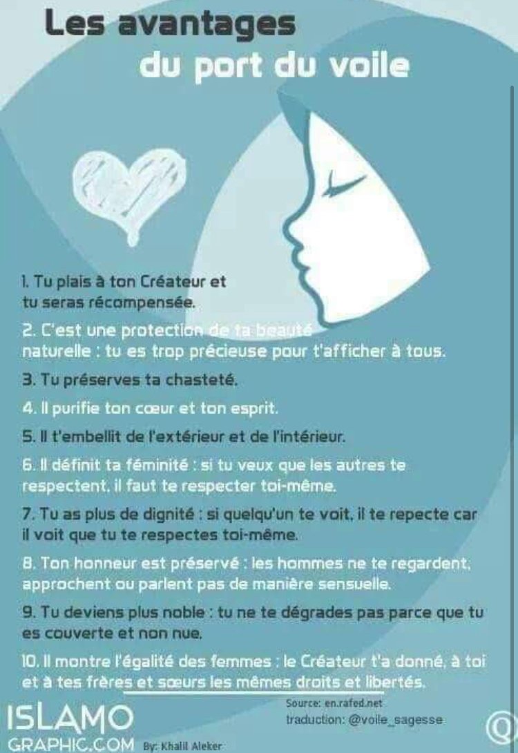 10) une femme non voilée montre son inégalité : le créateur ne lui donne pas, à elle et à ses frères et soeurs, les mêmes droits et libertés.