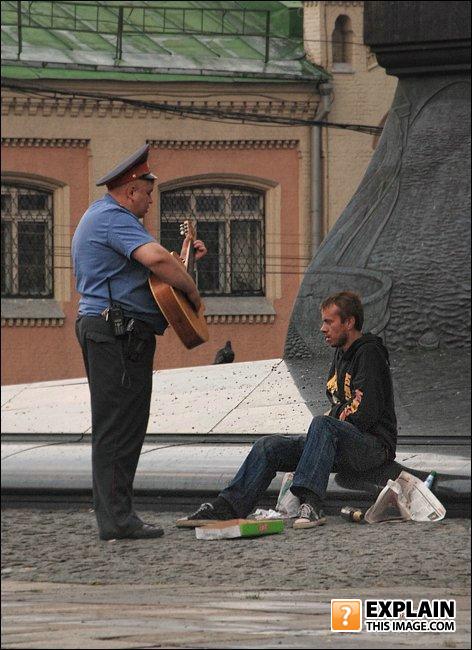 Le flic lui montre comment accorder sa guitare si il ne veut pas se prendre une prune.