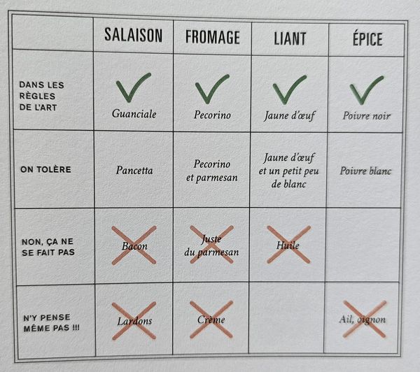 Donc le parmesan, le vieux comté, la pancetta, la poitrine fumée et autres "aberrations" sont des options possibles.