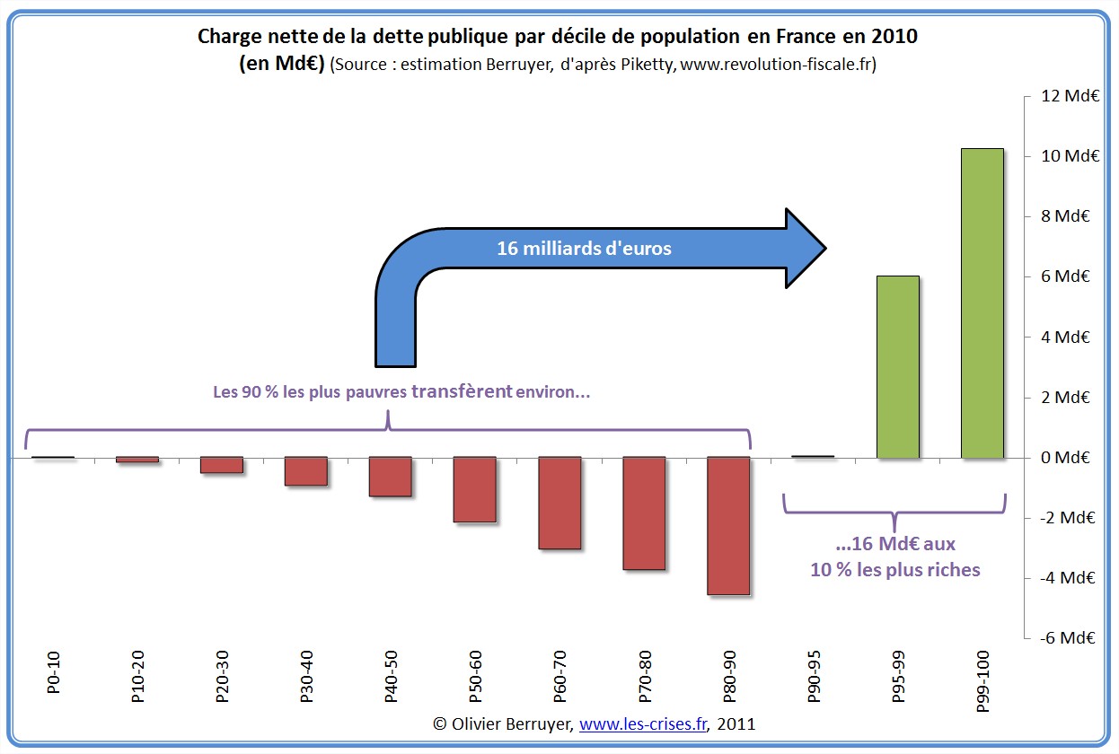 - alléger le poid de la dette, ce qui pénalise les 10% les plus riches qui possèdent 75% de la dette. Mécanisme qui favorise aussi les inégalités puisque les intérêts de la dette sont redirigés vers les tranches les plus riches de la population