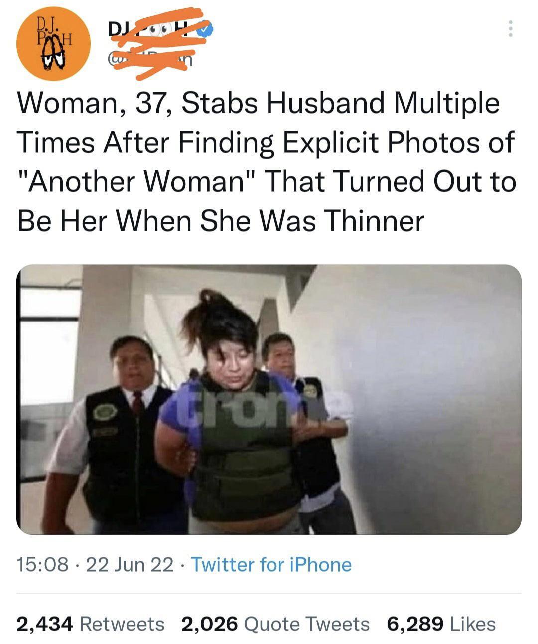 "Une femme de 37 ans poignarde son mari à de multiples reprises après avoir trouvé des photos d'une autre femme, qui s'est révélée être elle lorsqu'elle était plus maigre".