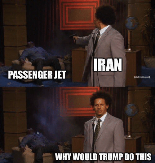 Sinon, c'est quoi encore que cette Trumperie : les iraniens abattent les avions qui décollent de chez eux ? Ou c'est vouloir trouver un prétextye à tout prix pour envahir l'Iran, comme le coup des ADM de Saddam ?